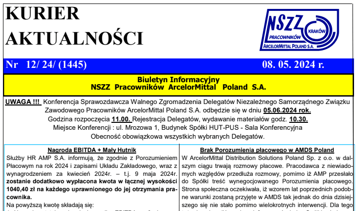 W związku z napiętą i dynamiczną sytuacją na rynku hutniczym oraz działaniami podejmowanymi przez AMP S.A. związanymi z ograniczaniem produkcji, strony związkowe podpisały z pracodawcą porozumienie dotyczące zasad wysyłania pracowników na tzw. „postojowe”. Porozumienie określa szczegółowy proces wysyłania pracowników na tzw. „postojowe”, włączając w to kolejność działań, które pracodawca musi podjąć przed przystąpieniem do tego […]